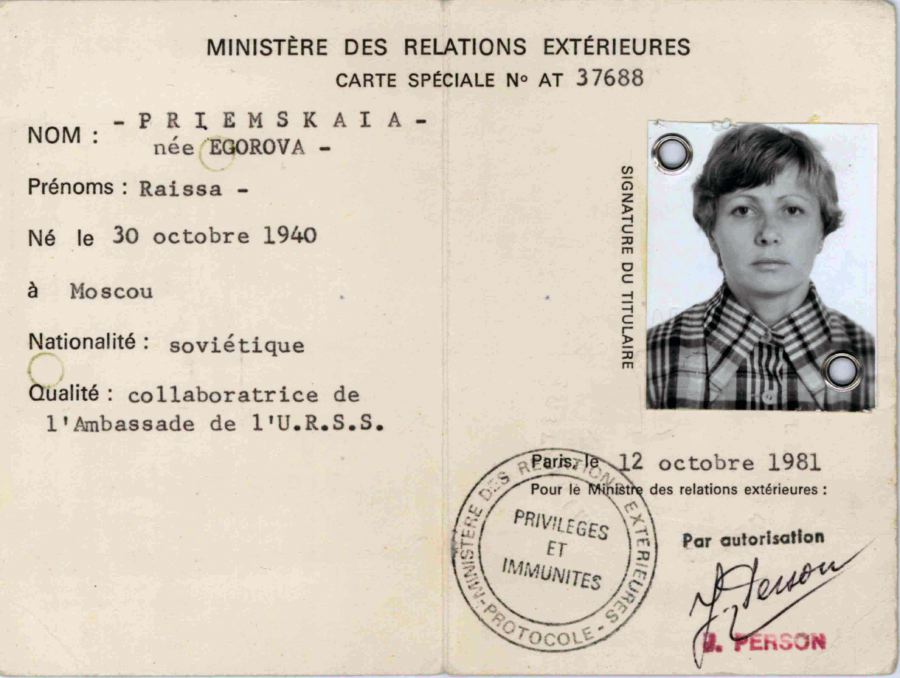 Такие карточки французское министерство иностранных дел выдавало проживавшим в стране дипломатам, техническим сотрудникам посольств и дипломатических миссий, а также тем, кто работал в представительствах международных организацийФото: из личного архива «Очень интересна архитектура здания — в виде треугольника. Очень современное, легкое. Трудно привыкнуть к обстановке непринужденности, легкости и простоты в работе этой конторы. В отделе переводов работают две русские женщины, которые почти всю жизнь провели в Париже. Они и по-русски говорят-то с акцентом. Внешне очень приветливы и симпатичны.