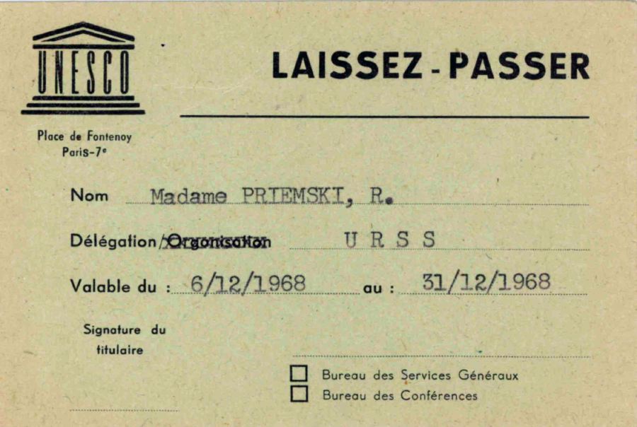 Удостоверение ЮНЕСКОФото: из личного архива «ЮНЕСКО — очень своеобразная организация. Тут можешь оказаться за одним столиком с чанкайшистом, а рядом сидит седой негр — личный друг Чомбе (президент Государства Катанга в 1960—1963, премьер-министр Республики Конго в 1964—1965) или индианки в ярких сари. В обеденный перерыв — он длится два часа — сотрудники, в основном женщины, выходят на террасу загорать. Иногда появляются кинолюбители, чтобы запечатлеть их».