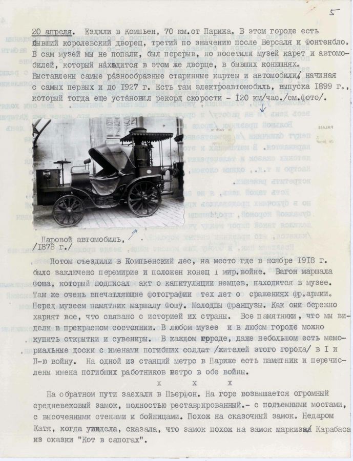 «Видели замечательный, незабываемый спектакль “Звук и свет”. Это зрелище организовано у некоторых старинных памятников — Нотр-Дама, Дворца инвалидов и у старинных замков в провинции. Мы видели Нотр-Дам.