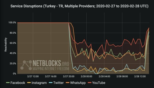 27 февраля Сирия нанесла удар по Идлибу, в результате которого погибли 33 турецких военнослужащих. Турция нанесла ответные удары по сирийской армии. После этого турецкие операторы заблокировали доступ к нескольким соцсетям. Предположительно, причиной сочли распространение в них недостоверных данных о числе погибших.