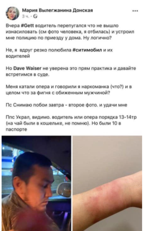 В посте Вылегжанина-Донская указала, что в ночь на 28 февраля таксист сервиса Gett попытался её изнасиловать. Она опубликовала фотографии, на одной из которых запечатлена рука с синяками. Девушка утверждала, что она отбилась — но у подъезда её встретили полицейские, которых вызвал водитель.