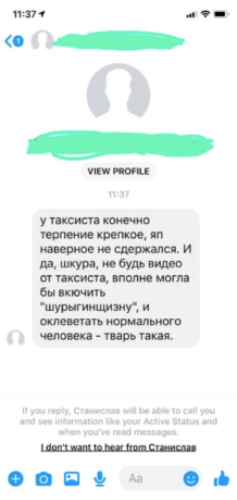 По словам Вылегжаниной-Донской, после публикации гендиректора Gett ей стали приходить угрозы. «Теперь мне реально страшно. У меня двухлетний ребёнок», — пожаловалась она, прикрепив поступившее ей сообщение.