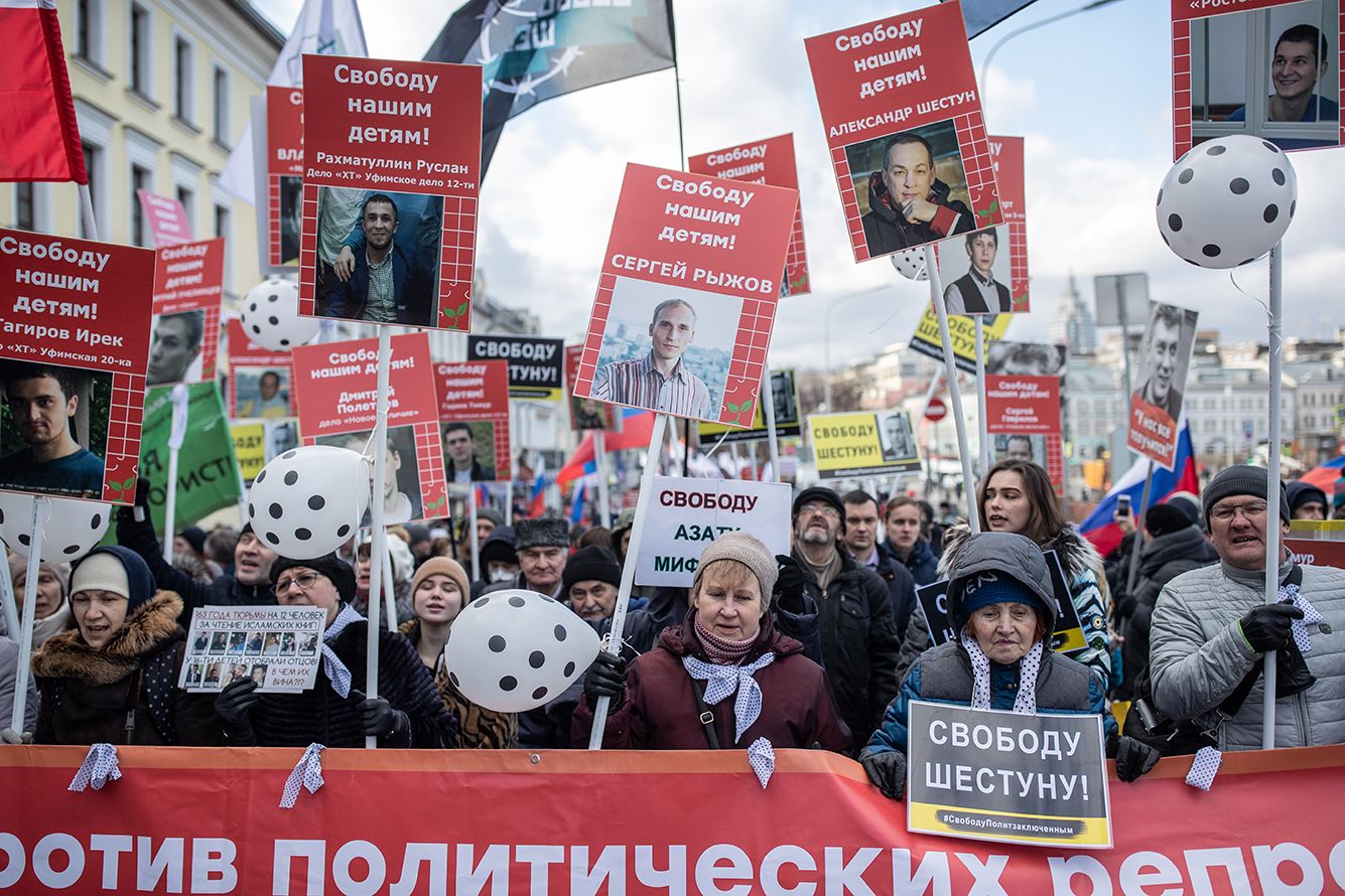 В Москве на марш тоже пришли вдвое больше людей, чем год назад. Участники шествия несли плакаты о деле «Сети» и поправках в Конституцию