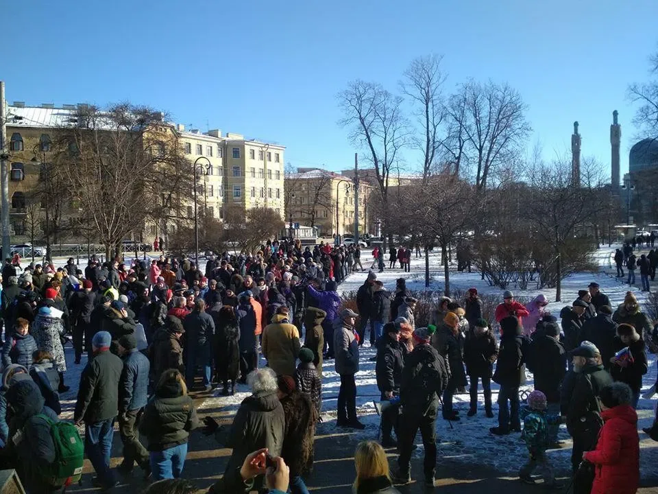 По оценкам «Бумаги», в акции принимают участие около двух тысяч человек. Во главе колонны идет депутат Законодательного собрания Петербурга Борис Вишневский. Участники марша собираются у металлодетекторов возле Соловецкого камня.