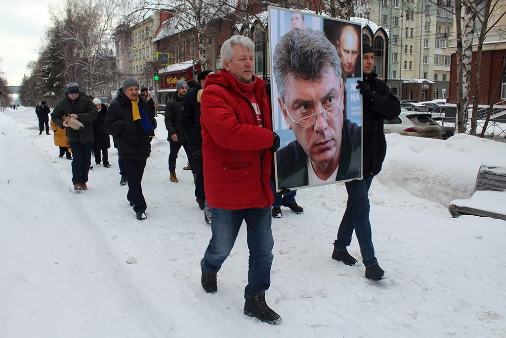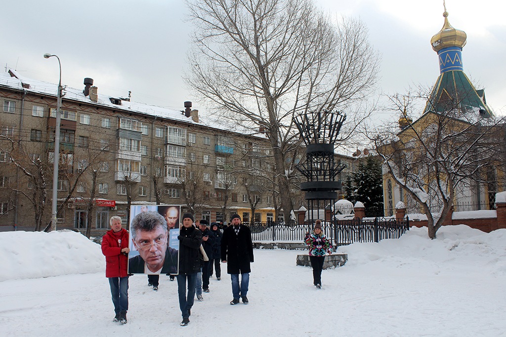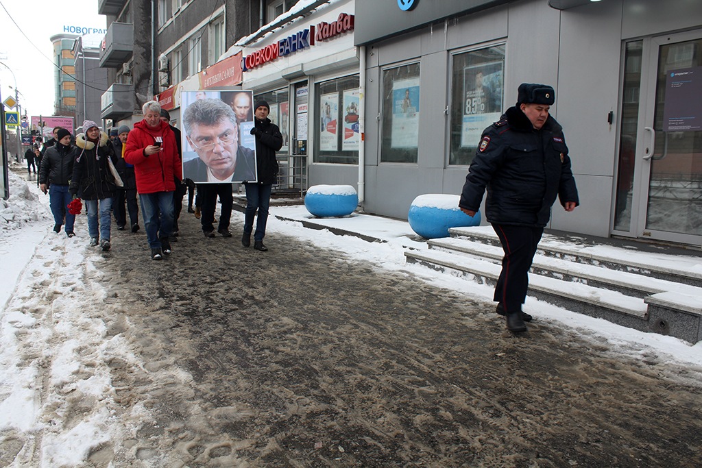 Мэрия Новосибирска запретила организаторам акции памяти Немцова шествие по аллее Красного проспекта, поэтому около 20 человек провели траурную процессию без лозунгов и плакатов. Впереди несли лишь портрет политика, убитого пять лет назад.