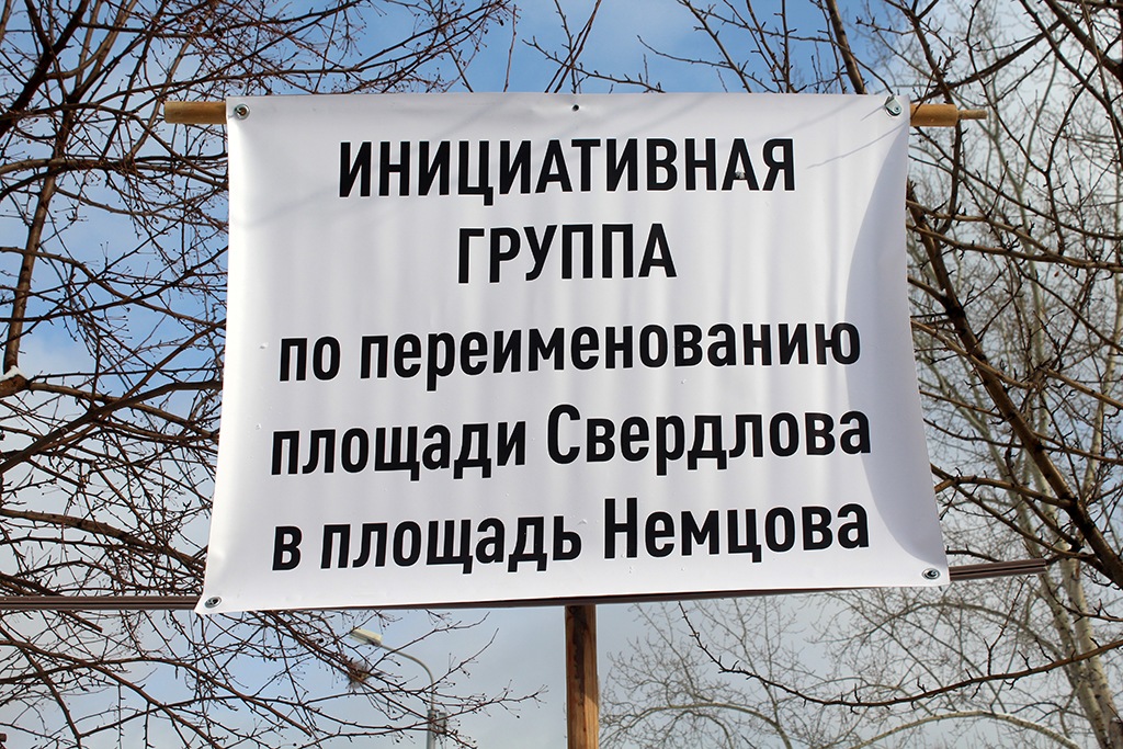 Андрей Заковряшин предложил переименовать площадь Свердлова в центре Новосибирска у регионального правительства в площадь Немцова. На митинге активисты начали сбор подписей для передачи в мэрию.