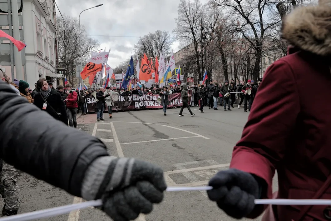 Сразу за рамками выстроились активистки «СоцФемАльтернативы» с плакатами в защиту женщин. «Руки прочь от права на аборт!», «Строй женское движение против патриархата, ксенофобии и капитализма!». Рядом дедушка в кепке и клетчатом шарфе с самодельным плакатом на деревянной рейке «Кто убил Немцова? Те, кто наверху». Парень из огромного пакета достает плакаты и раздает: «Моя Россия сидит в тюрьме» — написано на них.