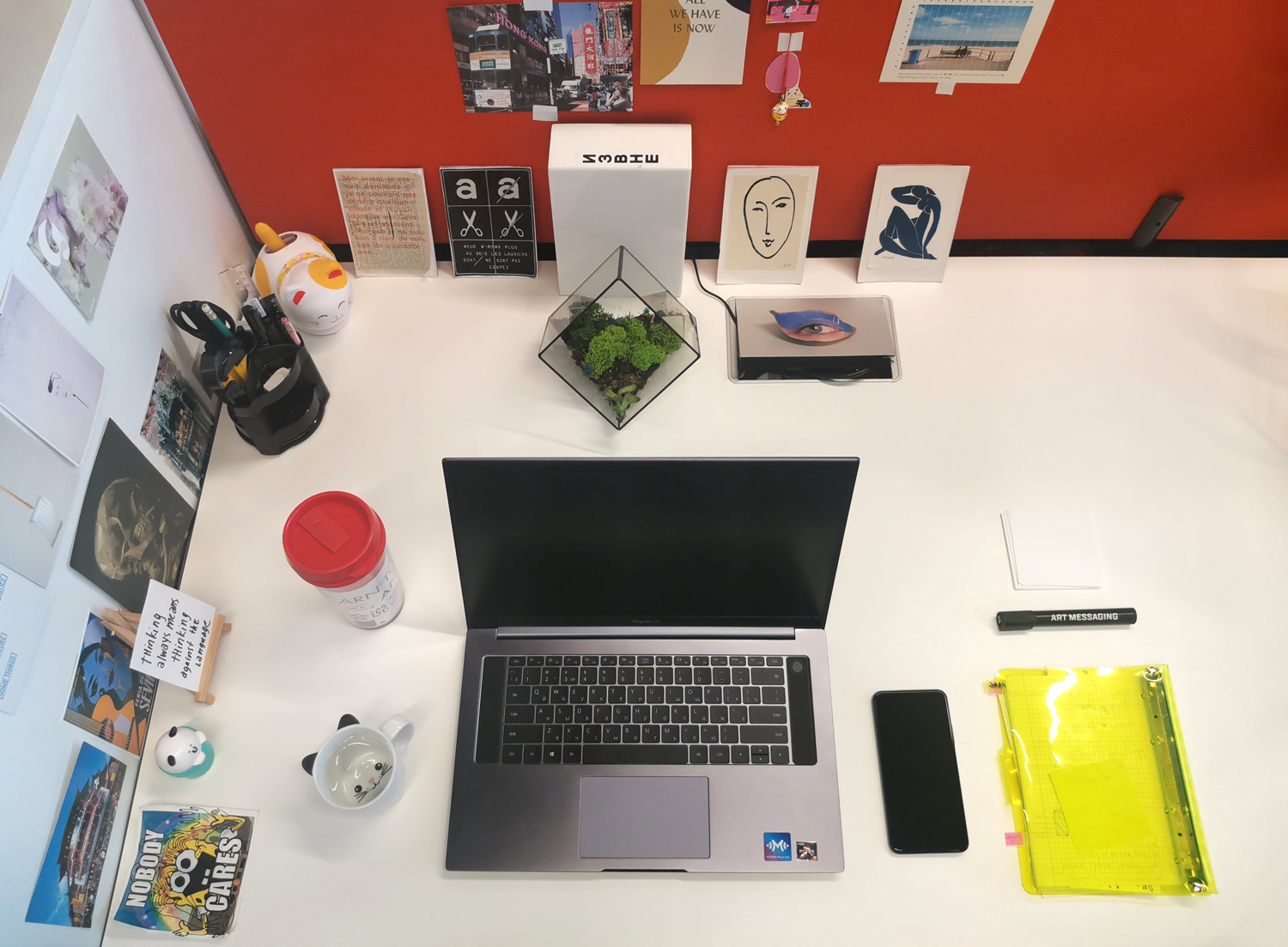 Вот так, например, выглядит стол Оксаны, которая работает редактором-копирайтером. На нем — ноутбук, смартфон, блокнот с записями, стикеры и маркер. Кружка для чая напоминает о двух голодных котах, которые ждут дома, и стимулирует не задерживаться. Рабочее пространство украшают открытки, привезенные коллегами из путешествий, репродукции работ Марселя Бротарса и Анри Матисса, а еще цитата Славоя Жижека о языке.
