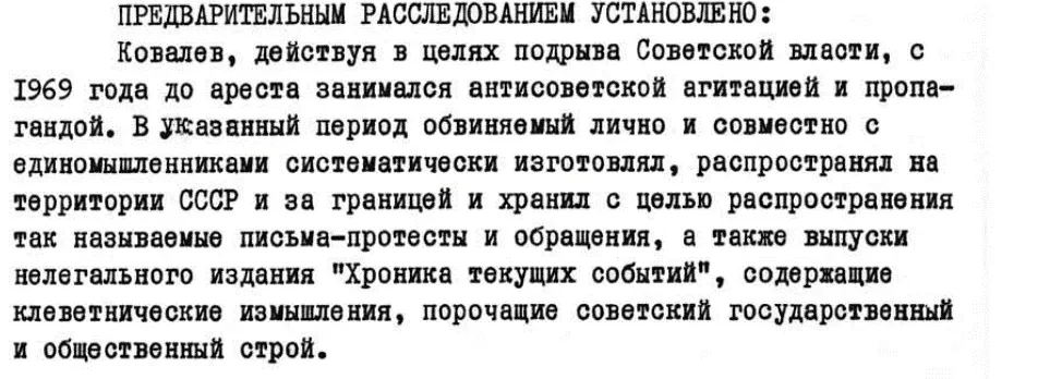 С начала 70-х годов и до своего ареста в декабре 1974-го Ковалев — один из редакторов неподцензурного информационного бюллетеня «Хроника текущих событий». Издание квалифицируется властями как «клеветнический антисоветский бюллетень». Хроника (1968–1982) — периодическое издание, фиксировавшее информацию о нарушениях прав человека в СССР. Тиражировалось в домашних условиях, на пишущих машинках. В 1972 году после выхода 27-го выпуска издание было приостановлено. Причина — шантаж со стороны КГБ, открыто угрожавшего арестами после каждого нового выпуска, причем вовсе не обязательно арестованы будут именно те, кто делал этот выпуск. К началу мая 1974 года пропущенные выпуски «Хроники» были готовы. В доме у Ковалева состоялась короткая пресс-конференция для иностранных корреспондентов: «Мы прочитали заявление о нашей ответственности за распространение, вовсе не редактирование хроники: не считая, вопреки неоднократным утверждениям органов КГБ и судебных инстанций СССР, «Хронику текущих событий» нелегальным или клеветническим изданием, мы сочли своим долгом способствовать как можно более широкому ее распространению. Мы убеждены в необходимости того, чтобы правдивая информация о нарушении основных прав человека в Советском Союзе была доступна всем, кто ею интересуется. 7 мая 74 года. Татьяна Великанова, Сергей Ковалев, Татьяна Ходорович».