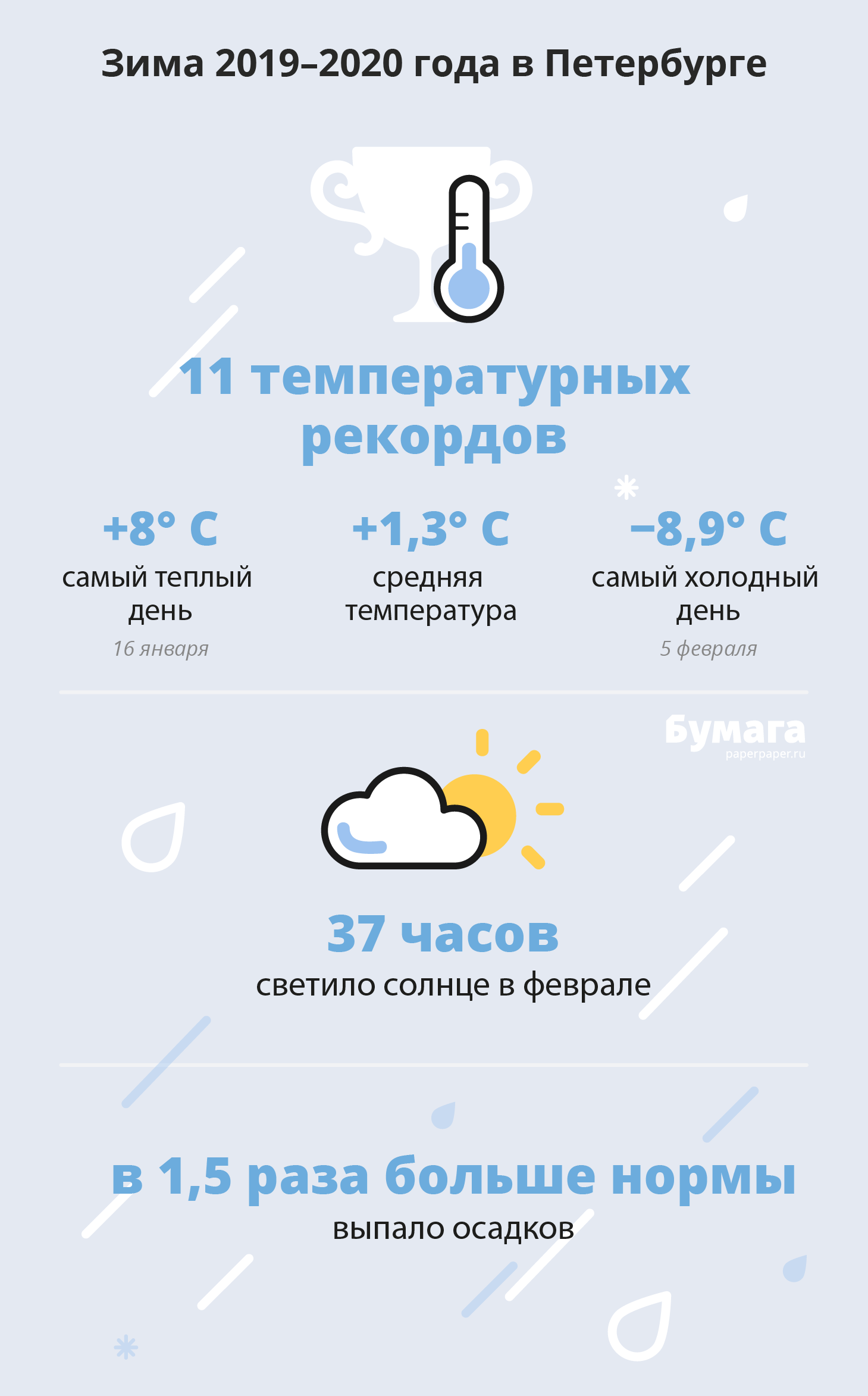 Итоги аномально теплой зимы в Петербурге — в одной картинке. Средняя температура, рекорды и самый холодный день