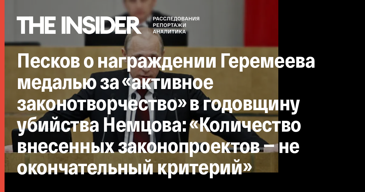 Песков о награждении Геремеева медалью за «активное законотворчество» в годовщину убийства Немцова: «Количество внесенных законопроектов — не окончательный критерий»