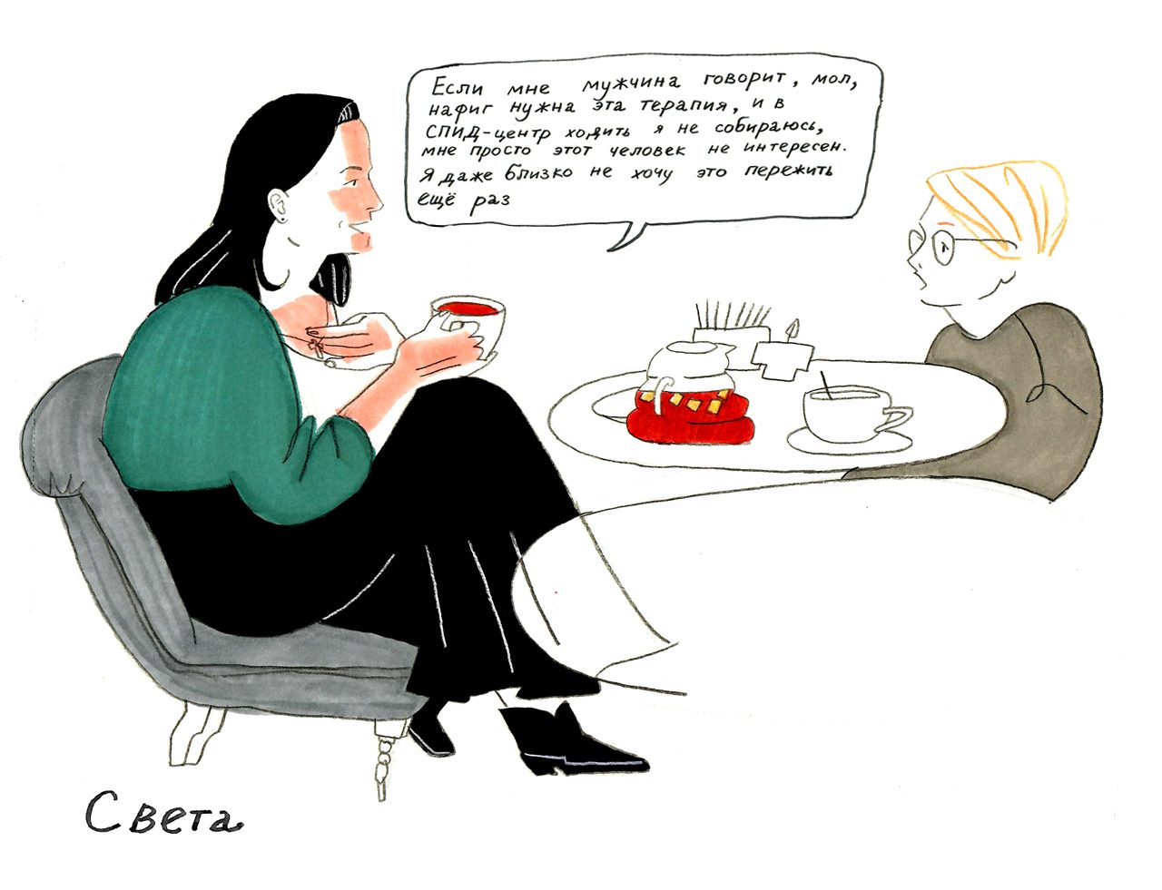 «Если мне мужчина, например, говорит, мол, нафиг нужна эта терапия, и в “СПИД-центр” ходить я не собираюсь, мне просто этот человек становится неинтересен, — говорит Света. — Я даже близко не хочу пережить это еще раз, очень уж это тяжело. Да, я слышу иногда от знакомых: “Не хочу пить терапию, боюсь”. На такое я отвечаю: “Хочешь, на кладбище сходим? Экскурсию тебе проведу”. Может быть, кто-то задумается».