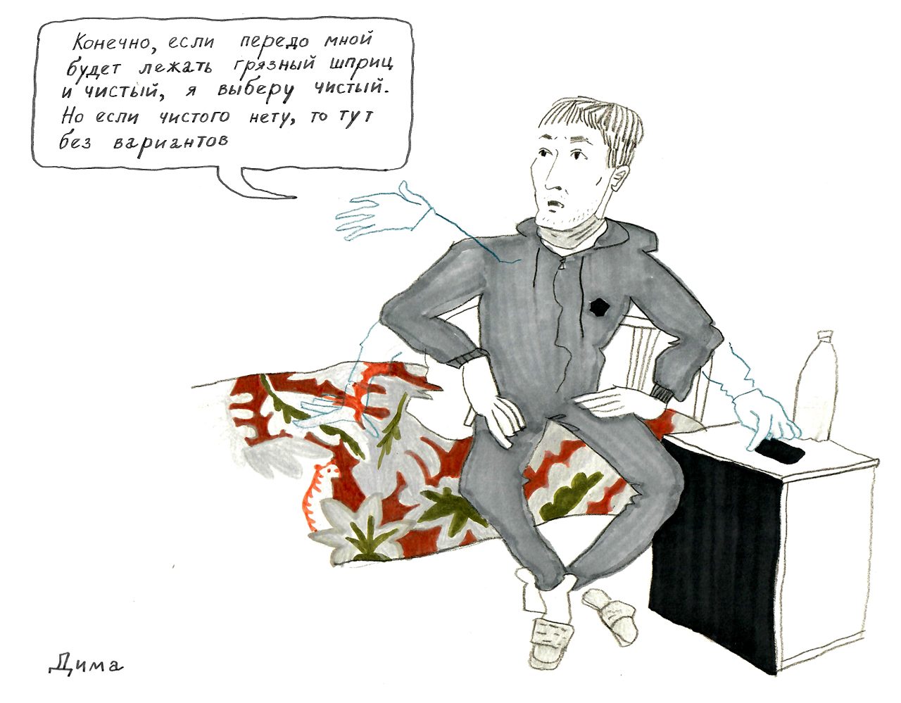 «Конечно, если передо мной будет лежать грязный шприц и чистый, я выберу чистый. Но если чистого нету, то тут без вариантов», — говорит Дима.