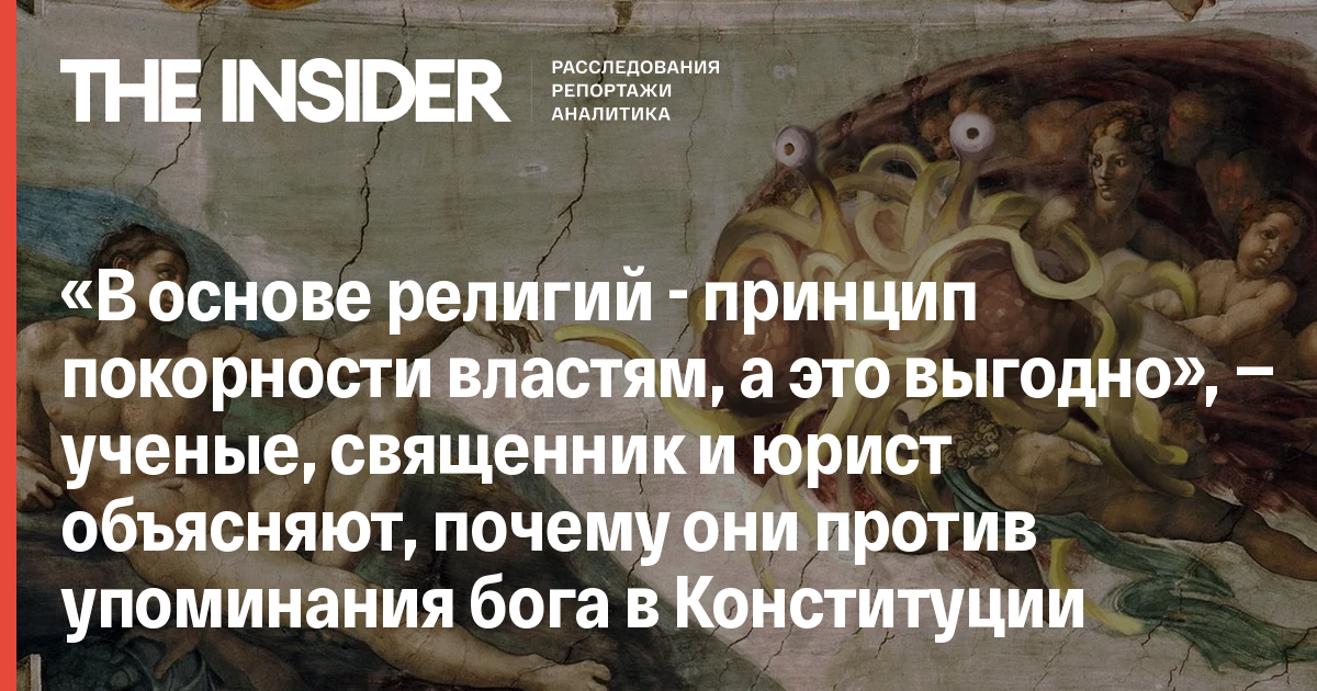 Владимир Путин, предложивший ряд поправок в Конституцию, выступает за внесение в основной закон понятия «бог». «Российская Федерация, объединенная тысячелетней историей, сохраняя память предков, передавших нам идеалы и веру в Бога, а также преемственность в развитии российского государства, признает исторически сложившееся государственное единство», — именно эта фраза должна появиться в Конституции. Пресс-секретарь Путина на вопросы журналистов о смысле этих слов (какой именно бог? какие именно идеалы?) ответил: «Я думаю, это будет своевременно прояснено. Я не могу ответить на этот вопрос сейчас». The Insider поговорил с учеными, священниками, юристами разных религиозных взглядов, которые объясняют, почему эта инициатива вызывает у них неприятие.