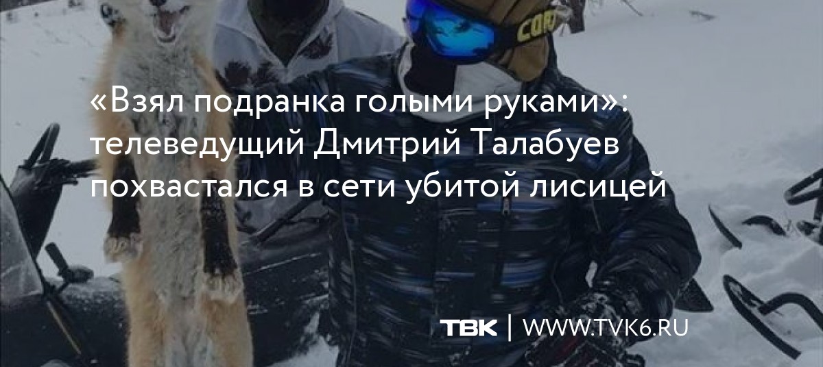 Бывший красноярский телеведущий, ведущий программы на «Первом канале» Дмитрий Талабуев похвастался в своем Facebook фотографией убитой на охоте лисицы.