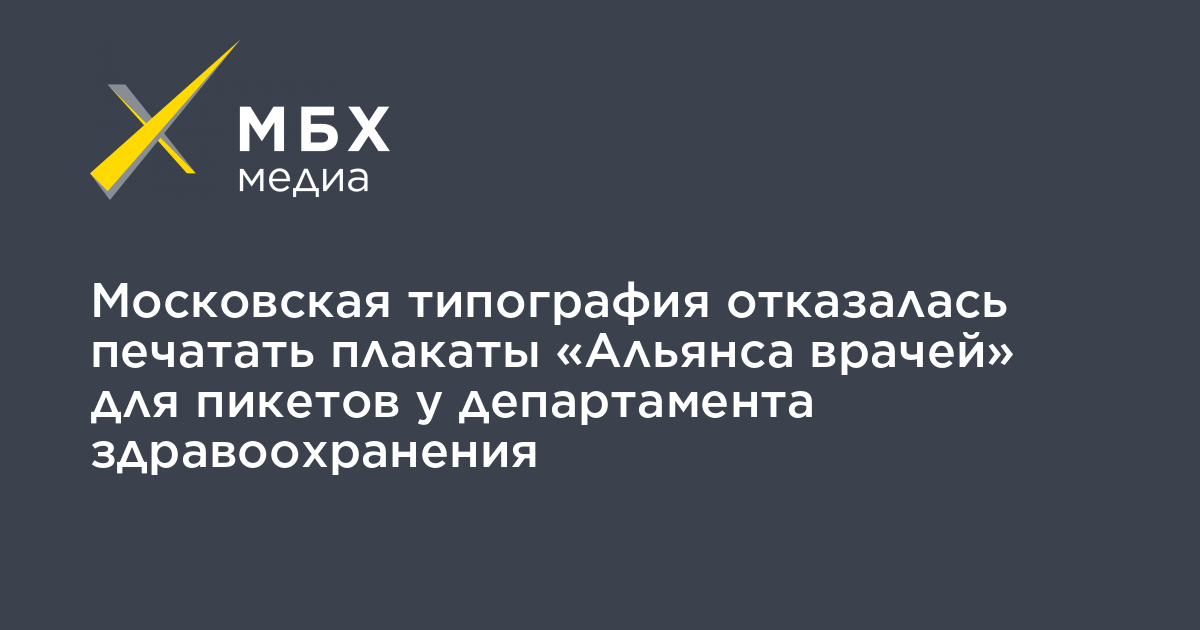 Московская типография MDM PRINT отказалась печатать плакаты профсоюза «Альянс врачей» для субботних пикетов у департамента здравоохранения столицы. Об этом «МБХ медиа» сообщил пресс-секретарь «Альянса врачей» Иван Коновалов.