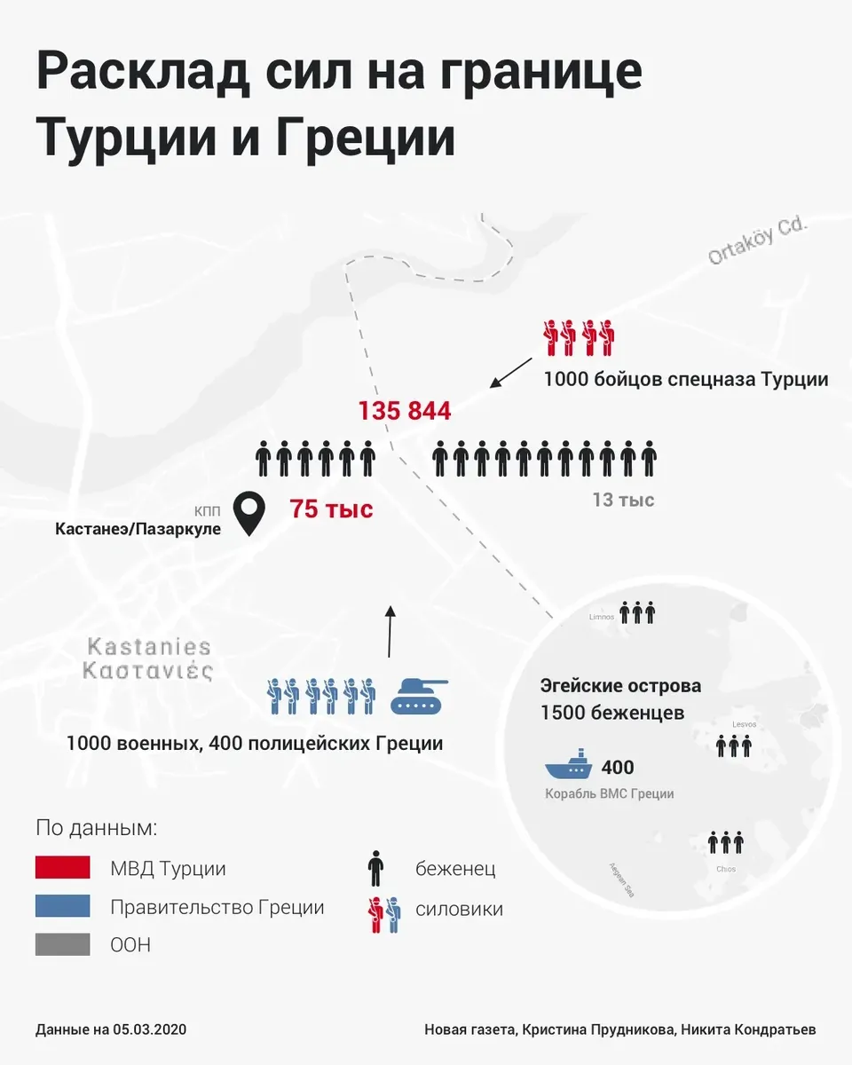Греция разместила на границе минимум 1 тыс. военных, 400 полицейских, бронетехника и две десантные роты. Они применяют слезоточивый газ и светошумовые гранаты.