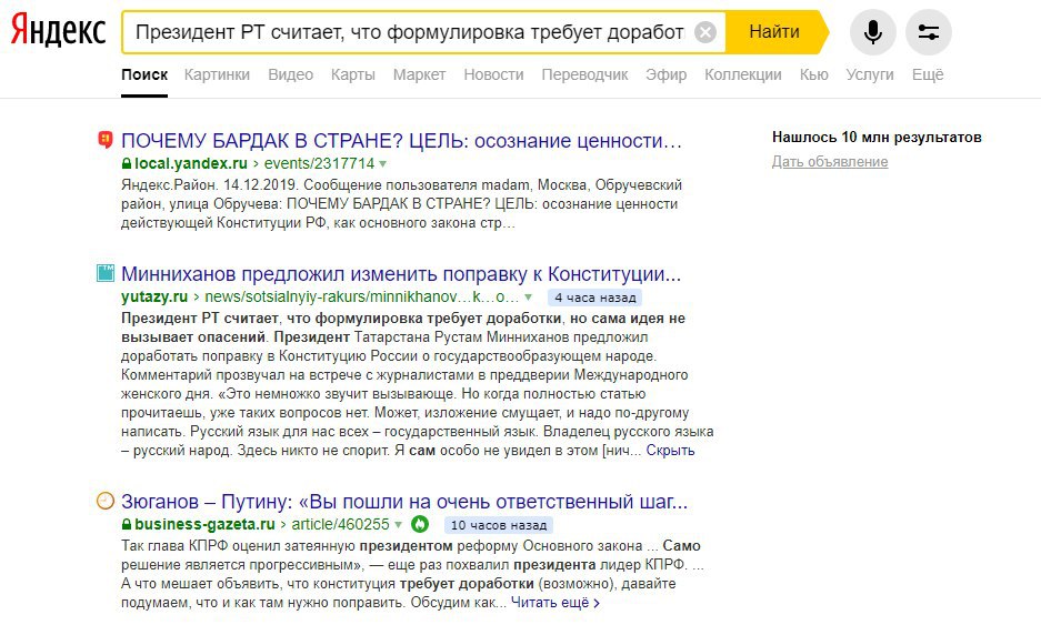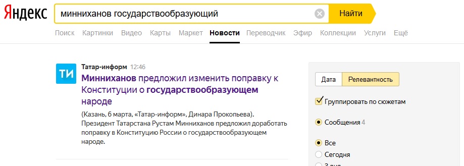 "Президент РТ считает, что формулировка требует доработки, но сама идея не вызывает опасений. Президент Татарстана Рустам Минниханов предложил доработать поправку в Конституцию России о государствообразующем народе. Комментарий прозвучал на встрече с журналистами в преддверии Международного женского дня. "Это немножко звучит вызывающе. Но когда полностью статью прочитаешь, уже таких вопросов нет. Может, изложение смущает, и надо по-другому написать. Русский язык для нас всех – государственный язык. Владелец русского языка – русский народ. Здесь никто не спорит. Я сам особо не увидел в этом [нич..."... Информационные сообщения с таким текстом были опубликованы сегодня на сайте ИА "Татар-информ", а также на сайте газеты "Ютазинская новь". Обе публикации были удалены практически сразу, однако поисковые системы успели сохранить их в своих базах.