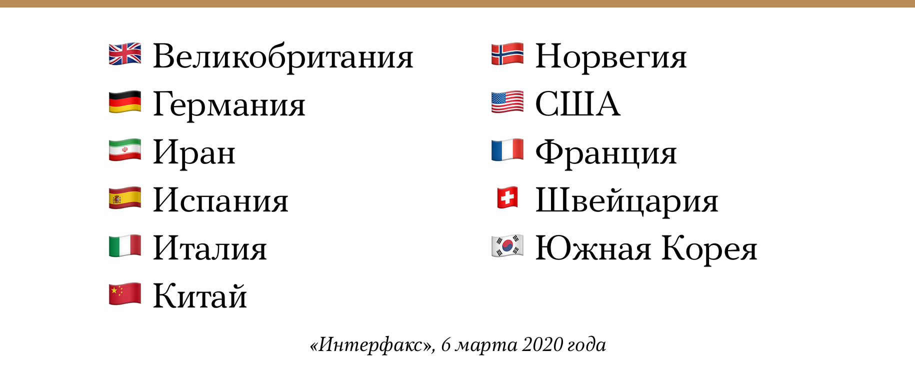 5 марта мэр Москвы Сергей Собянин подписал указ о введении в городе повышенной готовности из-за эпидемии коронавируса. В нем, в частности, содержалось требование к гражданам, недавно побывавшим в наиболее пострадавших от коронавируса странах, устроить самоизоляцию на две недели — не ходить на работу и учебу и «минимизировать посещение» общественных мест. 6 марта в департаменте здравоохранения Москвы уточнили список этих стран.