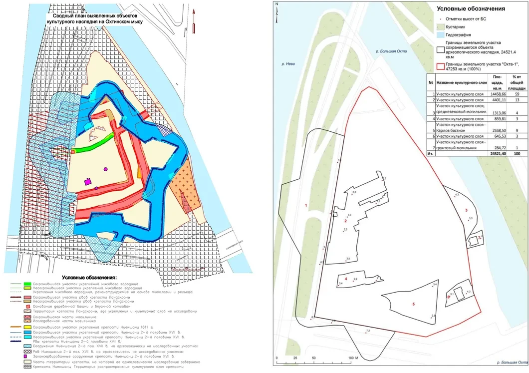 И по оценкам Петра Сорокина (руководителя археологической экспедиции, на протяжении нескольких лет проводившей раскопки на Охтинском мысу), под охраной оказались в основном не раскопанные археологами зоны, где как раз ничего особо ценного практически нет. Тогда как почти 80% территории заняты так и не взятыми под охрану археологическими объектами, включая остатки выявленных археологами крепостей.