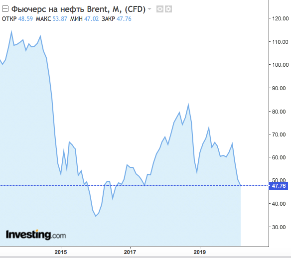 По состоянию на 14.15 мск цена на нефть Brent (фьючерсы на май 2020 года) составляла $47,7 за баррель. Минимальное значение за сегодня составляло $47,02. Последний раз такие показатели были в июле 2017 года.