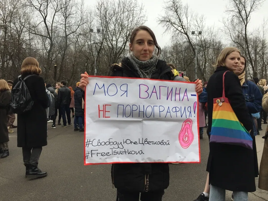 На митинг участницы пришли с плакатами «Свободу сестрам», «Жертвы, а не убийцы», «Моя вагина — не порнография, свободу Юлии Цветковой».