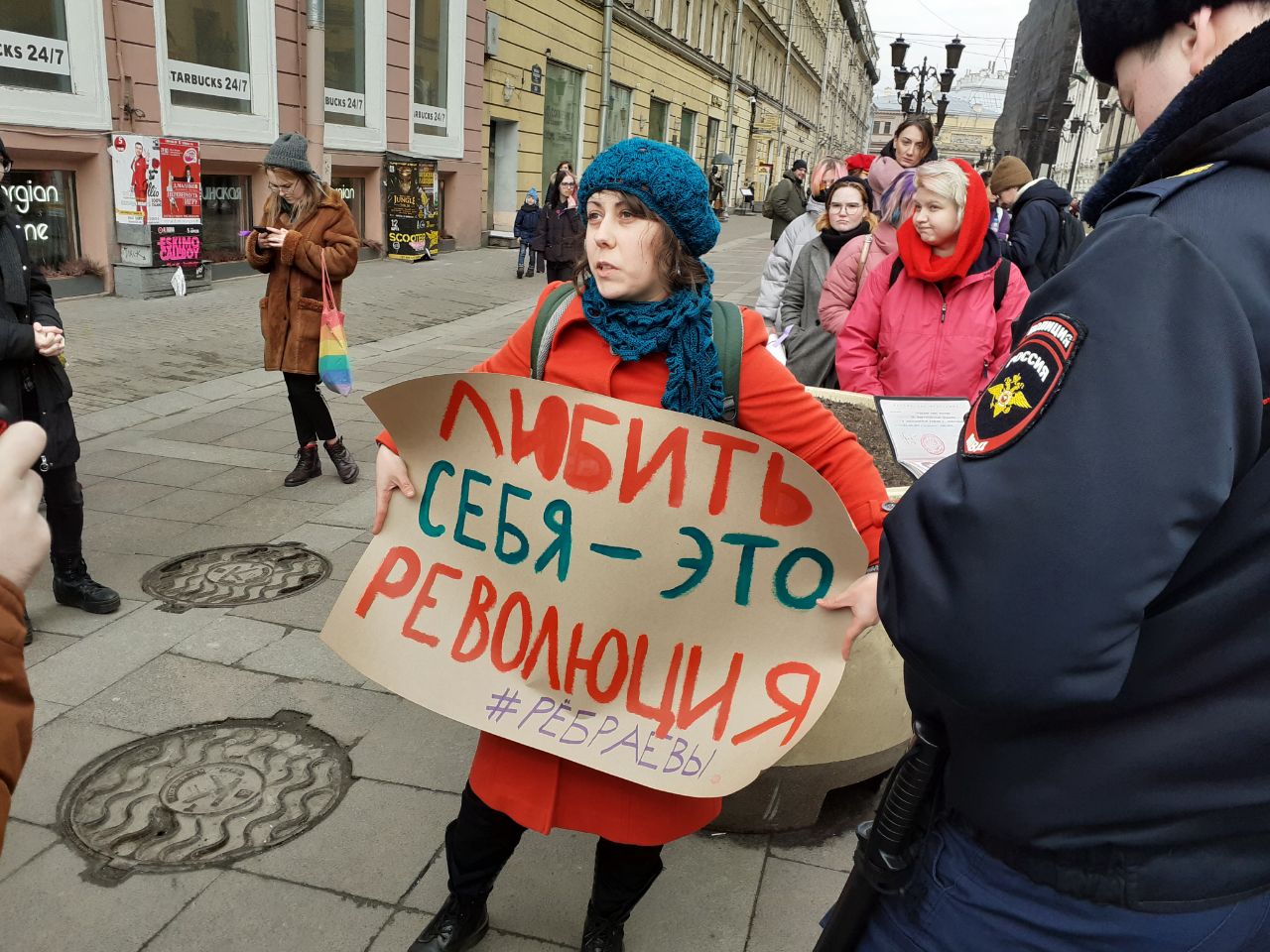 В Петербурге активистки движения "Восьмая инициативная группа" устроили на Невском проспекте одиночные пикеты за права женщин, сообщает корреспондент сайта Север.Реалии. В пикетной очереди стоят около 100 человек. Девушки пришли с плакатами "Любить себя – это революция", "Насилие – не семейная ценность", "Свободу женщинам-политзаключенным".