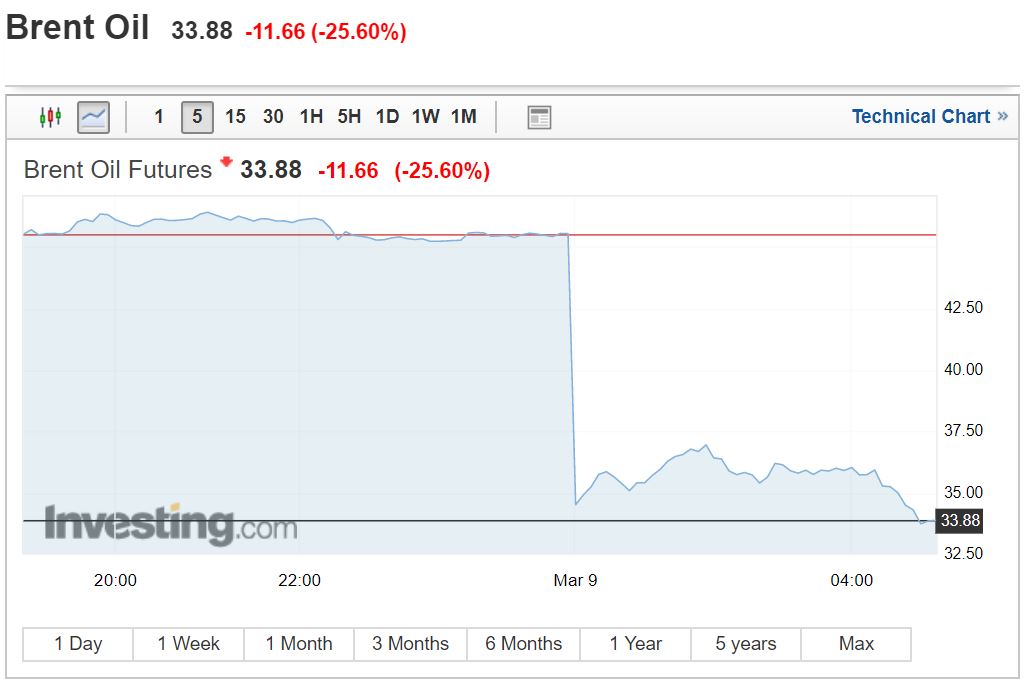 Обвал цены на нефть на открытии биржи ICE в 1:00 мск в понедельник стал худшим со дня начала операции «Буря в пустыне» в 1991 году. Уже в первые минуты торгов баррель Brent провалился сразу на 30%, или на $15. На минимуме цена достигала $31,02. К 4:30 мск падение скорректировалось до 25%, а цена — до $34.