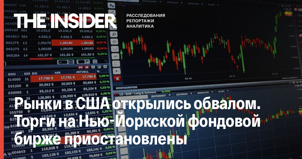 Рынки в США открылись обвалом: индекс S&P 500 в первые минуты торгов упал на 6,9%, Dow Jones — на 7%. Торги на Нью-Йоркской фондовой бирже приостановлены.
