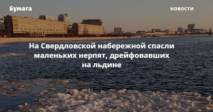 В районе Свердловской набережной 9 марта выловили двух щенков нерпы, дрейфовавших на льдине. Об этом сообщили очевидцы в группе «ДТП и ЧП» во «ВКонтакте».
