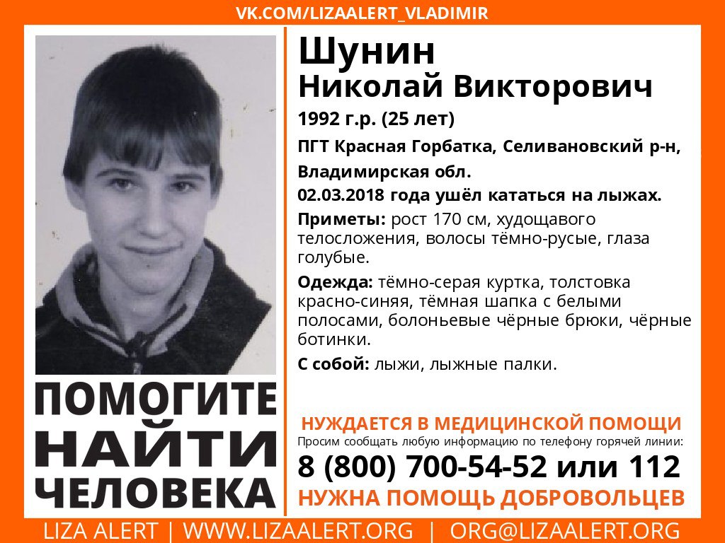 27-летнего Николая Шунина из посёлка Красная Горбатка Селивановского района не могут найти уже 2 года. Поисково-спасательный отряд “Лиза Алерт” продолжает поиски.