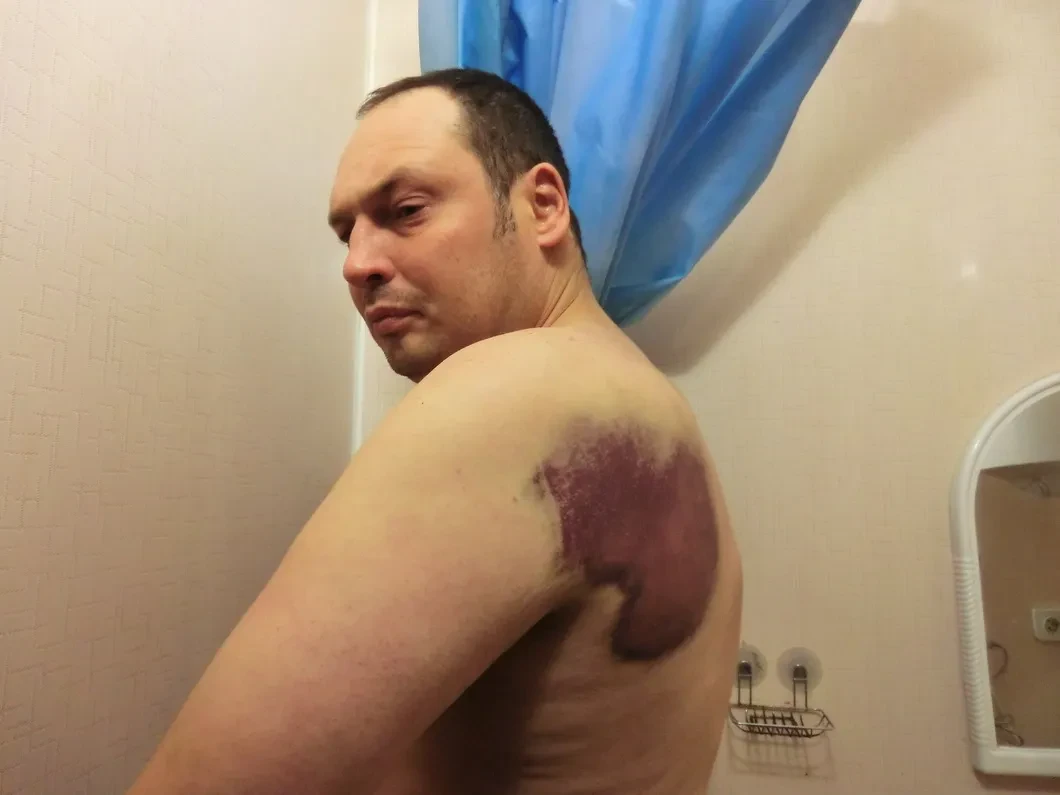 На фотографии, где Иван дома, уже находясь под домашним арестом с браслетом на ноге, стоит у холодильника, у него темные пятна по всему телу. На голени, под коленом, возле почек и самая большая бордовая гематома — на лопатке.