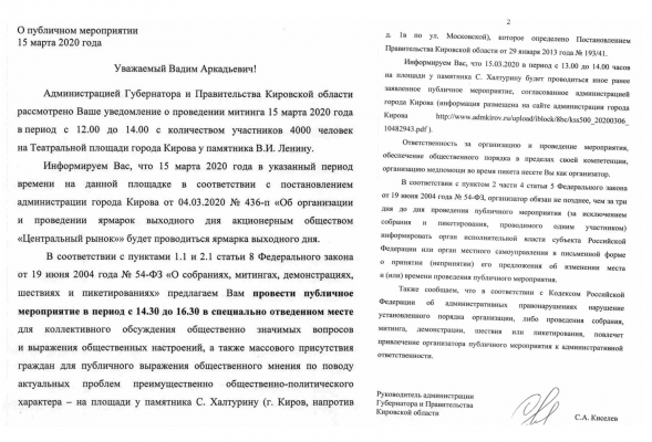Однако власти отказались согласовать митинг, сославшись на то, что 15 марта на Театральная площади будет ярмарка выходного дня. Остальные 30 вариантов чиновники проигнорировали, но предложили активистам провести митинг в другое время и в другом месте — у памятника Степану Халтурину на окраине города.