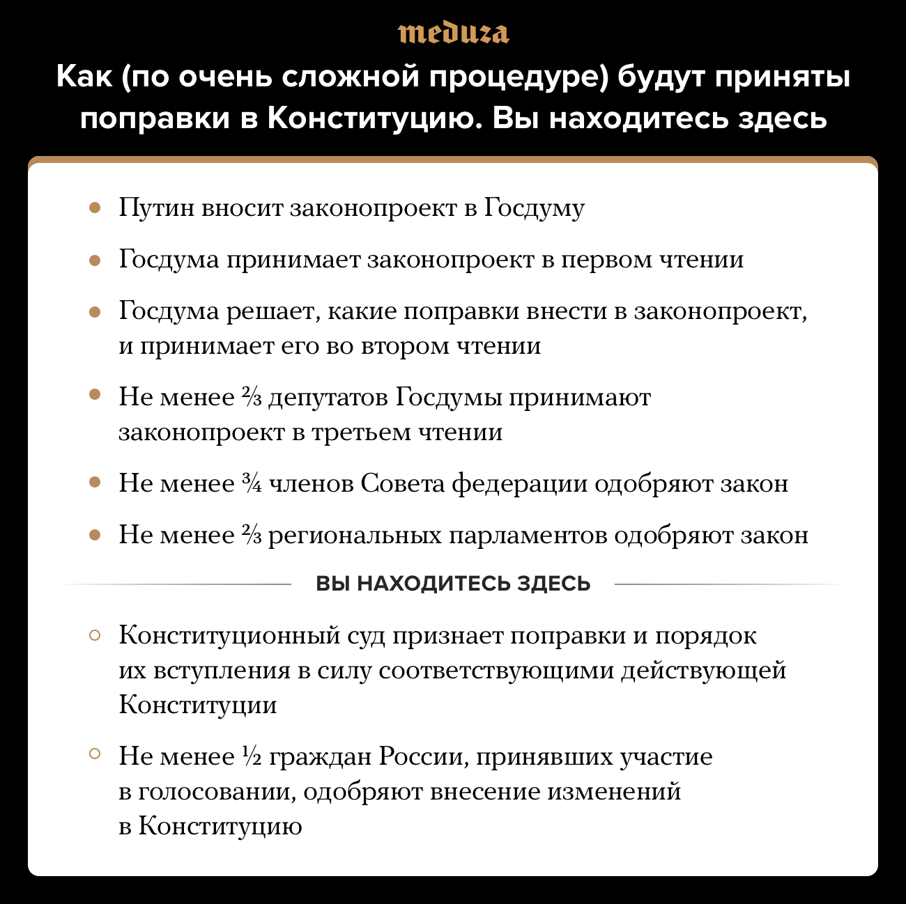 Поддержка двумя третями регионов — необходимое условие для внесения изменений в Конституцию. Оно прописано в 136-й статье основного закона.