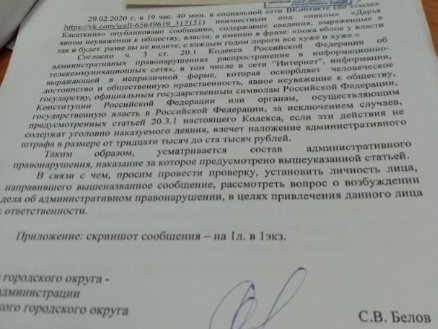Белов просит привлечь авторов комментариев к ответственности по статье о неуважении к власти (ч. 3 ст. 20.1 КоАП). На каждый комментарий чиновник подготовил отдельное заявление.
