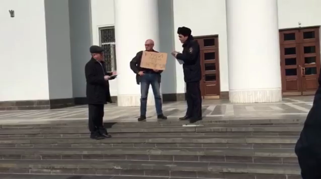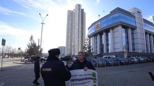8:00. В Екатеринбурге у законодательного собрания Свердловской области задержали активиста Сергея Тиунова с плакатом «Нет узурпации власти». Об этом он сам рассказал ОВД-Инфо.