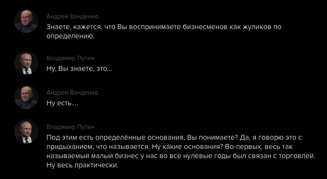 Интервьюер Андрей Ванденко сказал, что ему кажется, будто Путин «воспринимает бизнесменов как жуликов по определению». Президент не стал спорить: «Под этим есть определенные основания, вы понимаете? <...> Ну какие основания? Во-первых, весь так называемый малый бизнес у нас во все нулевые годы был связан с торговлей...» На уточняющий вопрос («То есть я правильно понял, торгаш — жулик?»), Путин ответил утвердительно.
