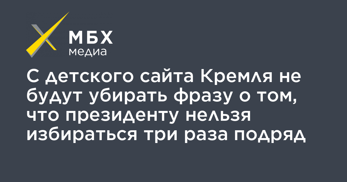 На детском сайте Кремля написано, что «один и тот же человек не может быть избран президентом больше двух раз подряд». «Даже если все граждане в полном восторге от своего президента, выбирать его три раза подряд нельзя. Это будет незаконно», — указывается там.
