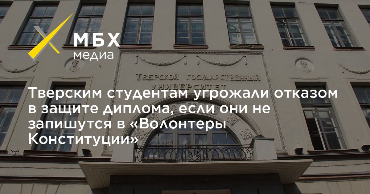 Преподаватели юридического факультета Тверского государственного университета угрожали студентам тем, что они не сдадут диплом, если откажутся участвовать в проекте «Волонтеры Конституции». Об этом сообщил «МБХ медиа» журналист Владимир Федулов, которому пожаловались учащиеся.