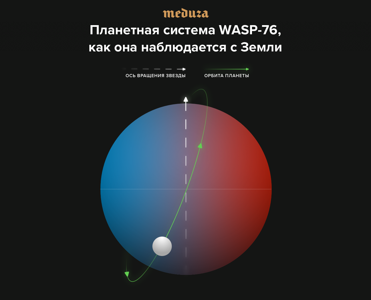Четыре года назад у ничем не примечательной звезды WASP-76 в созвездии Рыб обнаружили экзопланету. Тоже ничем не примечательную — газовый гигант чуть легче Юпитера, вращается очень быстро и близко от своей звезды, год длится всего 1,8 земных дня. Ее автоматически назвали WASP-76b. Вторая строчная буква латинского алфавита указывает, что в той звездной системе это второе открытое небесное тело после, собственно, самой звезды.