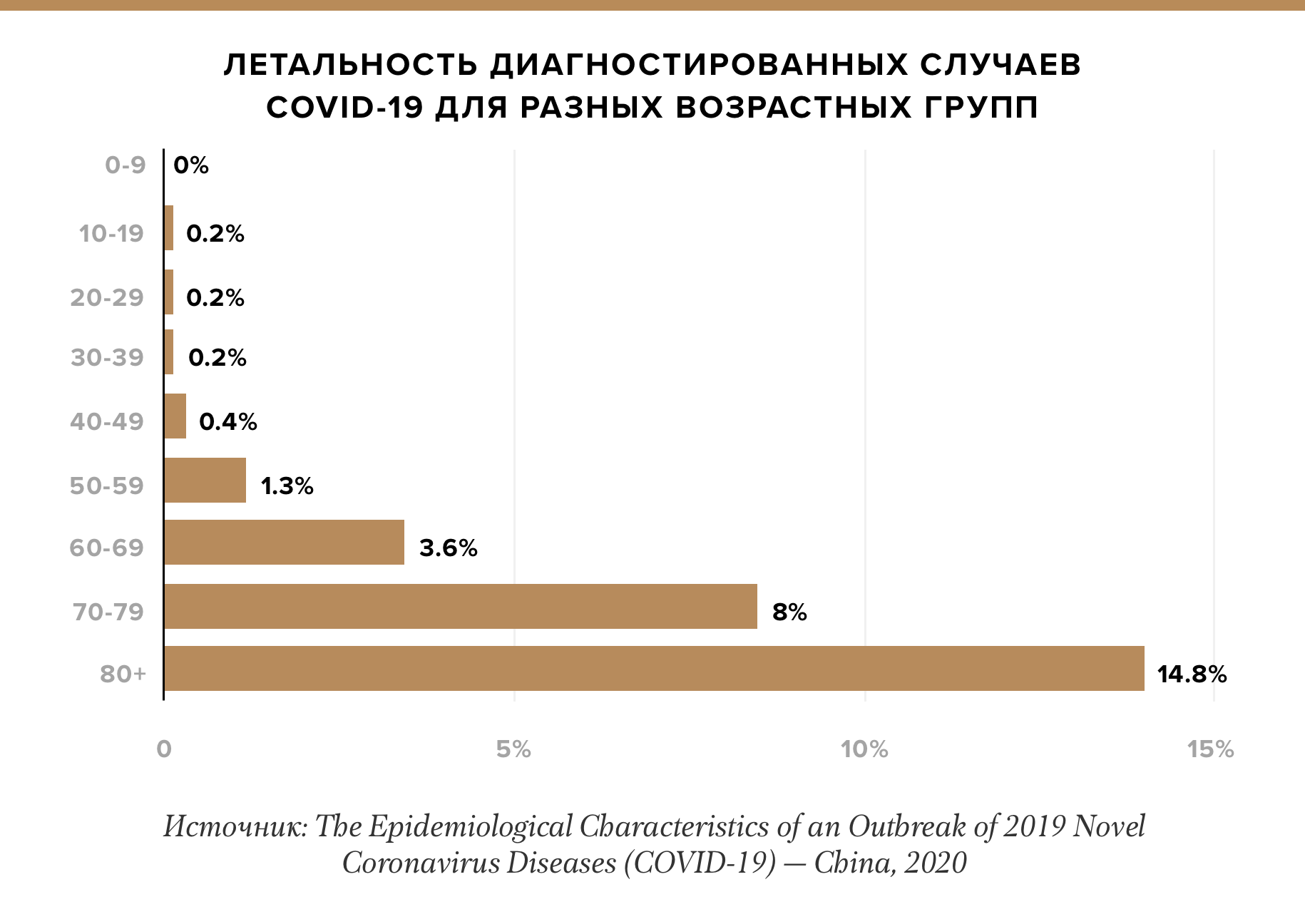 Коронавирусная инфекция COVID-19 опасна прежде всего для людей старшего возраста — риск осложнений и даже летального исхода резко увеличивается с возрастом пациента. В то же время распространителями вируса могут стать и дети, и молодые люди. У части из инфицированных вообще не развиваются симптомы, однако они все равно представляют опасность для своих пожилых родственников. График составлен на основе эпидемиологических данных китайского центра по противодействию инфекционным заболеваниям (CCDC), они учитывают статистику по состоянию на 11 февраля 2020 года. В данные включены только диагностированные случаи заболевания, поэтому представленная летальность может быть завышена относительно тотального числа инфекций, в том числе скрытых и бессимптомных.