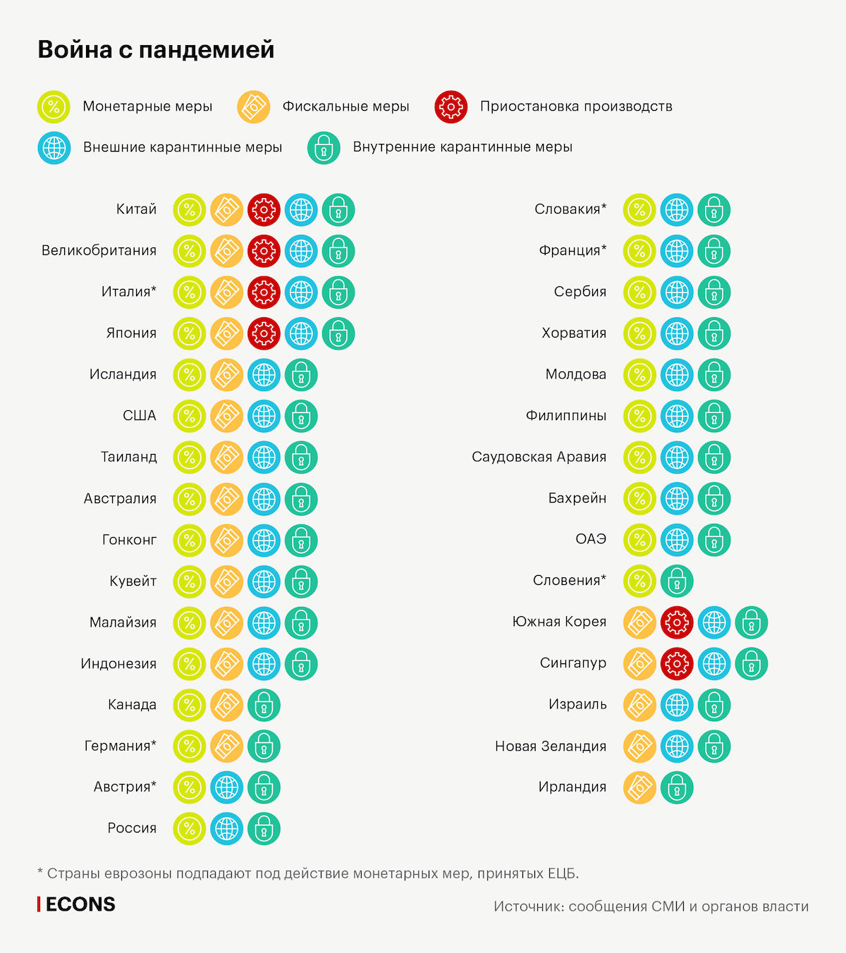 Программы бюджетной поддержки анонсировали (либо уже проводят) как минимум 18 стран. Некоторые из них реагируют на распространение вируса масштабными стимулирующими программами, некоторые — отдельными точечными мерами. Чаще всего получатели помощи — малый и средний бизнес, а основной способ их поддержки — снижение ставок по кредитам и налоговые льготы.