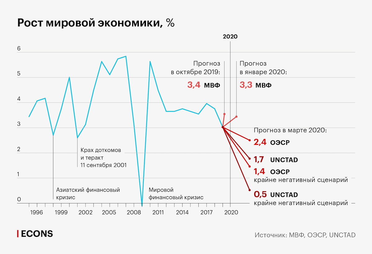 Распространение коронавируса, 11 марта официально признанное ВОЗ пандемией, может нанести мировой экономике ущерб в $1 трлн, прогнозирует UNCTAD, что предполагает торможение роста мирового ВВП до 1,9% — или глобальную рецессию (ею считается темп мирового роста ниже 2,5%). В худшем «сценарии судного дня», предполагающем повторную вспышку в Китае, экономический урон может возрасти вдвое, до $2 трлн. Схожие варианты (худший — при повторении китайского масштаба эпидемии во всем регионе Азии и развитых странах) прогнозирует ОЭСР (см. график).