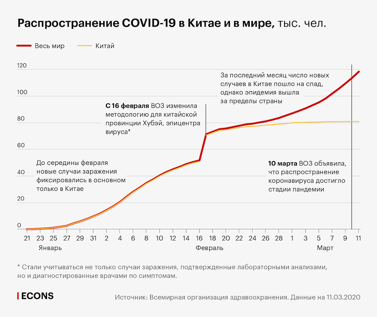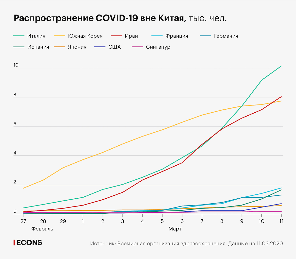 На 12 марта случаи заболевания коронавирусом зафиксированы в более чем 100 странах с совокупной долей в мировом ВВП в 96%; в том числе на долю стран, где число заболевших превысило тысячу, приходится порядка трети мировой экономики (это Китай, Италия, Иран, Корея, Франция, Испания и Германия; в США, по данным ВОЗ на 12 марта, заболевших 987). Скорость распространения вируса — число новых заболевших в день — вне Китая растет, в то время как в самом Китае, очаге возникшей эпидемии, ее удалось взять под контроль (см. график).
