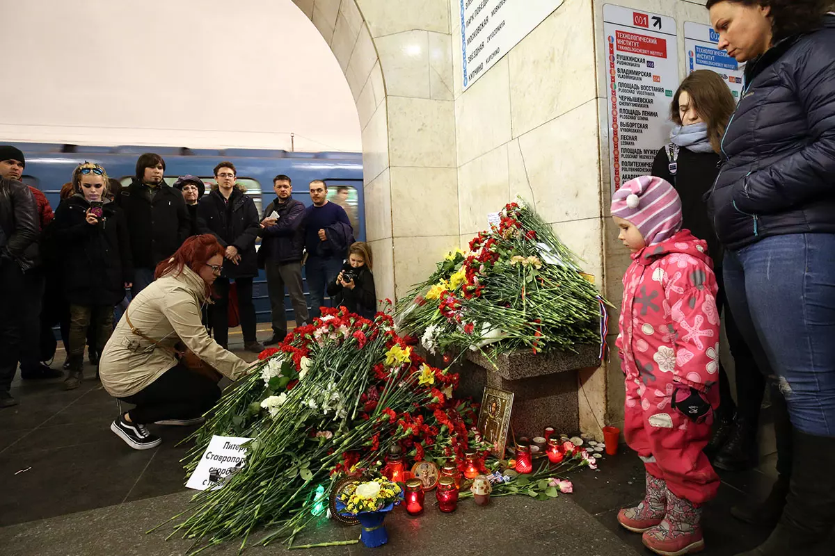 Во время возложения цветов на станции метро «Технологический институт» в память о погибших при взрыве 3 апреля 2017 года. Фото: Петр Ковалев / ТАСС
