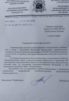 Организаторы не считают отказ целесообразным. «На митинге собралось бы не более 100–200 человек, можно было бы применить медицинские маски и угроза была бы исключена, это не такое большое количество людей. Возникает риторический вопрос — что опаснее для России, коронавирус или реакционная политика стоящих у власти капиталистов?» — отмечается на сайте.