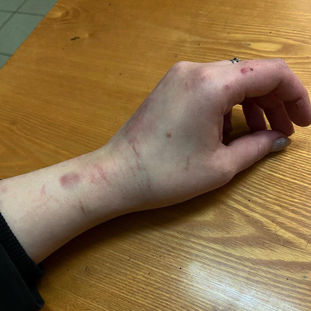 И все это время я не знала, что со мной происходит, то есть я не понимала, почему я там нахожусь. У меня забрали все вещи, после чего с меня сняли наручники, у меня обе руки были в крови, просто я испугалась, я не понимала, из какого места у меня идет кровь. Позже выяснилось, что у меня один палец просто почти до кости был разодран. Меня бросили в камеру. И мне было ужасно плохо, потому что у меня не было ни воды, ни капель для носа, у меня еще нос был заложен. В камере мы сидели где-то полтора часа, я просила вызвать мне скорую, потому что мне было ужасно плохо. И каким-то образом я все-таки докричалась до ребят, которые стояли за дверью, чтобы нас встретить, они вызвали мне скорую, которую пустили. Скорая проверила мое давление, оно было повышено. Проверили мою температуру, она была около 38°С. Скорая попросила сотрудников полиции меня госпитализировать, но им было отказано в этом. То есть сказали, что я задержана — и все, в принципе.