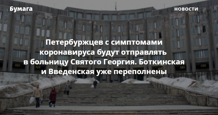 Изначально в новости сообщалось, что в больницу Святого Георгия будут отправлять петербуржцев с симптомами коронавируса. По уточненной информации, учреждение принимает пациентов с симптомами ОРВИ и гриппа, которые необязательно свидетельствуют о коронавирусной инфекции. Всех взрослых, вернувшихся из-за границы, с подозрением на коронавирус продолжают доставлять в Боткинскую больницу. Для избежания неправильной трактовки заголовок изменен, в текст добавлены пояснения.