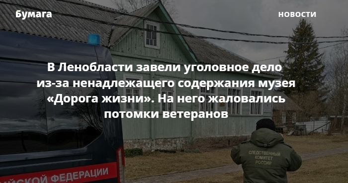 Сотрудники Следственного комитета по Ленобласти проверили музей «Дорога жизни» в деревне Коккорево во Всеволожском районе. Они установили, что здание находится в ненадлежащем состоянии. Возбуждено уголовное дело о нарушении требований сохранения памятников истории и культуры (ст. 243.1 УК РФ).