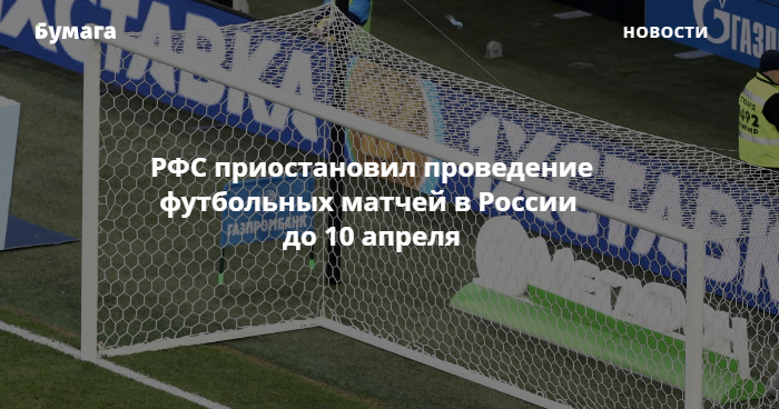 В России приостановили проведение всех футбольных мероприятий, проходящих под эгидой Российского футбольного союза, с 17 марта до 10 апреля включительно. Об этом говорится на сайте РФС.